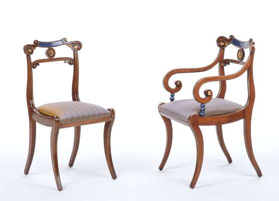 Chair with high back Italian manufacturer Isaaco Agostoni. Chairs with solid shaped backs, also presents options with or without armrests. The frame of this model is made of wood. Seat cover of high quality textile. A style classic.