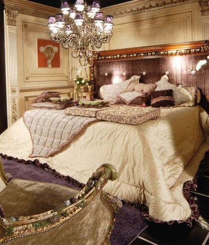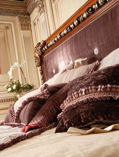 Double bed from Italian manufacturer Boiserie Italia. Model with a high square headboard. Frame made of solid wood. The surface is covered with a glossy varnish. Textile upholstery adorned with buttons. Decor - hand carved. The bed is made in classic style.