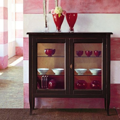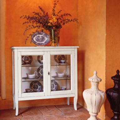 Low showcase from the Italian manufacturer Tonin casa. The frame and legs of solid wood. Sash glass in a wooden frame. Internal filling - glass shelves. Proposed finish lacquered white or natural wood color. The model is made in classic style.