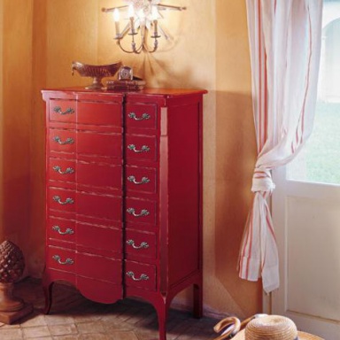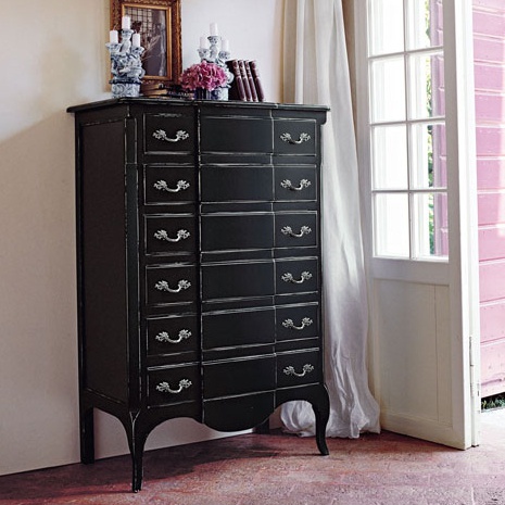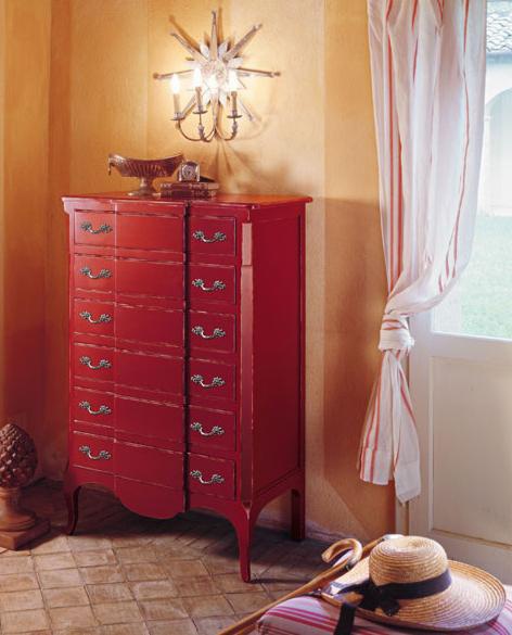 High chest of drawers from the Italian manufacturer Tonin casa. Includes a number of drawers. The frame and legs of solid wood. Surface high gloss colored lacquer in black or red. Accessories metal. The model is made in classic style.