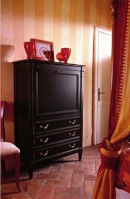 A Secretary with a hinged panel and drawers from the Italian manufacturer Tonin casa. The model is made in classic style. Material - solid wood. The Matt lacquer finish is offered in red or black. Pen boxes metal painted in Golden color.