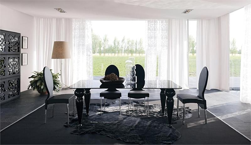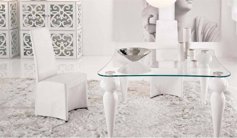 Dining table from the Italian manufacturer Tonin casa. Model on figured legs. The surface is painted with glossy varnish from the collection company. The table top offers a round, square or rectangular shape. The material is glass of the highest quality. The table is made in a modern style.