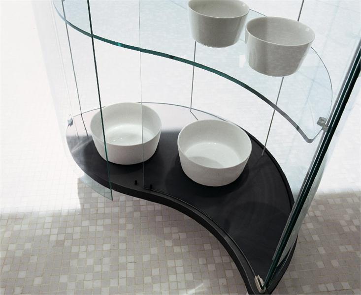Showcase from the Italian manufacturer Tonin casa. The model is made in modern style. Frame and shelves made of transparent glass. Legs in solid wood. The varnish finish offered in several colors. The design complements the built-in backlight.
