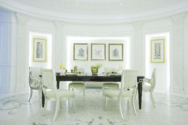 Set for the dining room from the Italian producer of Versace Home. Set includes rectangular dining table shape and chairs. The furniture is made of solid wood, the surface is treated with lacquer. Filler - polyurethane foam. Upholstery - textiles from a range of campaigns. D?cor - gilding. Set in a classic style. Colors: white, black.