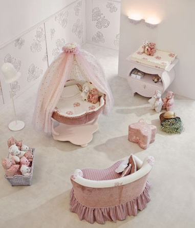 Headsets for children from the Italian manufacturer Halley, collection Bebe. The material is solid wood. Furniture richly decorated with carvings. Coating - high-gloss lacquer and eco-friendly water-based paints. The main decorative material present in the collection – textiles. Design complete - hangings, stitch-Capito, fringe. Colours in stock.