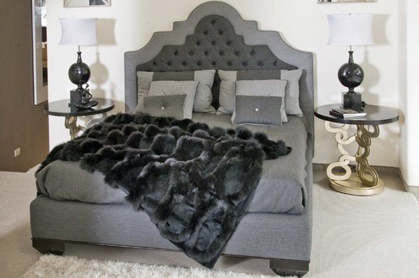 Double bed from Italian manufacturer Wama. Model with a high scalloped headboard. The frame and legs of solid wood. Upholstery textile. Model of decorative decorated with stitch - Capito. Made the bed in art Deco style. It is notable for originality of design and elegance.