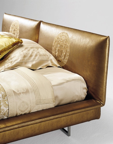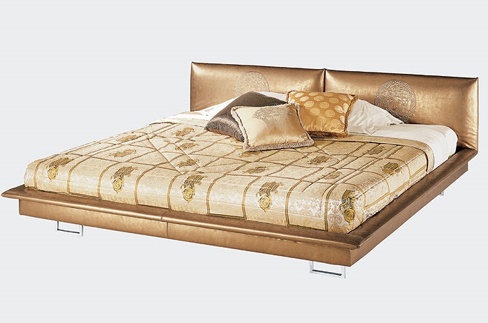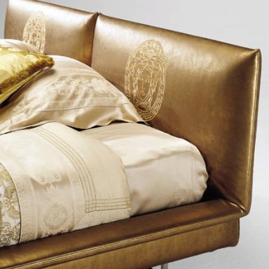 Double bed Spencer from the Italian producer of Versace Home. Model on low metal legs. The frame is hidden. The upholstery is available leather or textile. Upholstered headboard adorned with decorative pattern. The bed is made in a modern style.