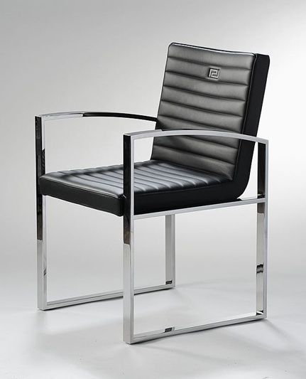 A Unique chair from the Italian producer of Versace Home. Model with hard armrests. The frame and legs are made from chromed metal. Seat and back upholstered in black leather and decorative stitching. The chair is made in a modern style. Is characterized by durability and practicality.