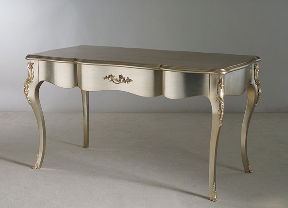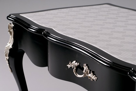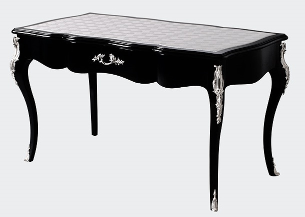 Desk Berenice from the Italian producer of Versace Home. The model is made in classic style. Frame and sculpted wood legs. Surface treated high gloss lacquered black. In the presence of a built-in drawer complemented with a metal handle. The table is decorated with hand-carved.
