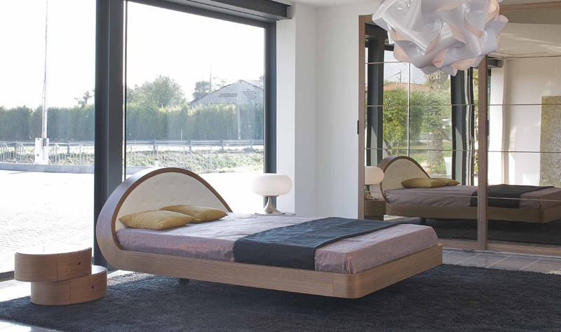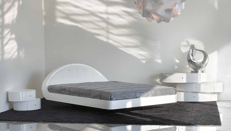 Double bed Nido from the Italian manufacturer Voltan. Model with a rounded headboard. Material - solid wood. Legs in chromed metal. Offered lacquer finish in white. Fabric upholstery with decorative stitch-Capito. The bed is manufactured in contemporary style.