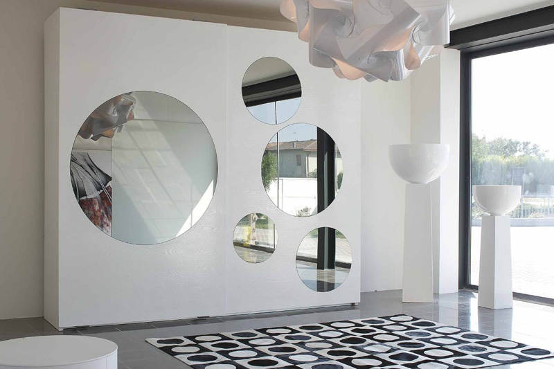Wardrobe Nido from the Italian manufacturer Voltan. Frame made of solid wood. Low legs are made of metal. The finish offers a glossy white lacquer. The facade is adorned with decorative glass inserts round shape. The model is characterized by spaciousness and elegance. The bed is manufactured in contemporary style.