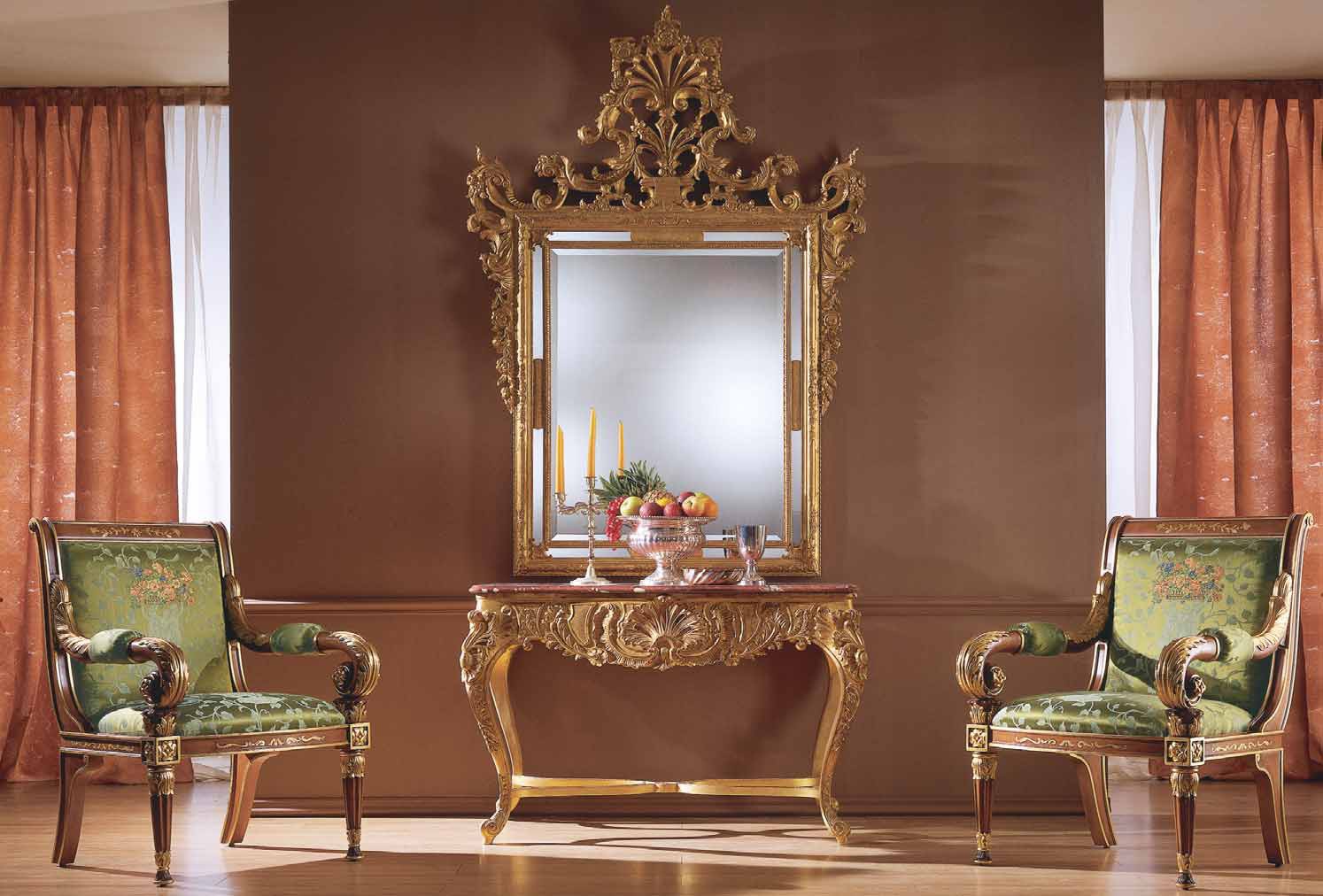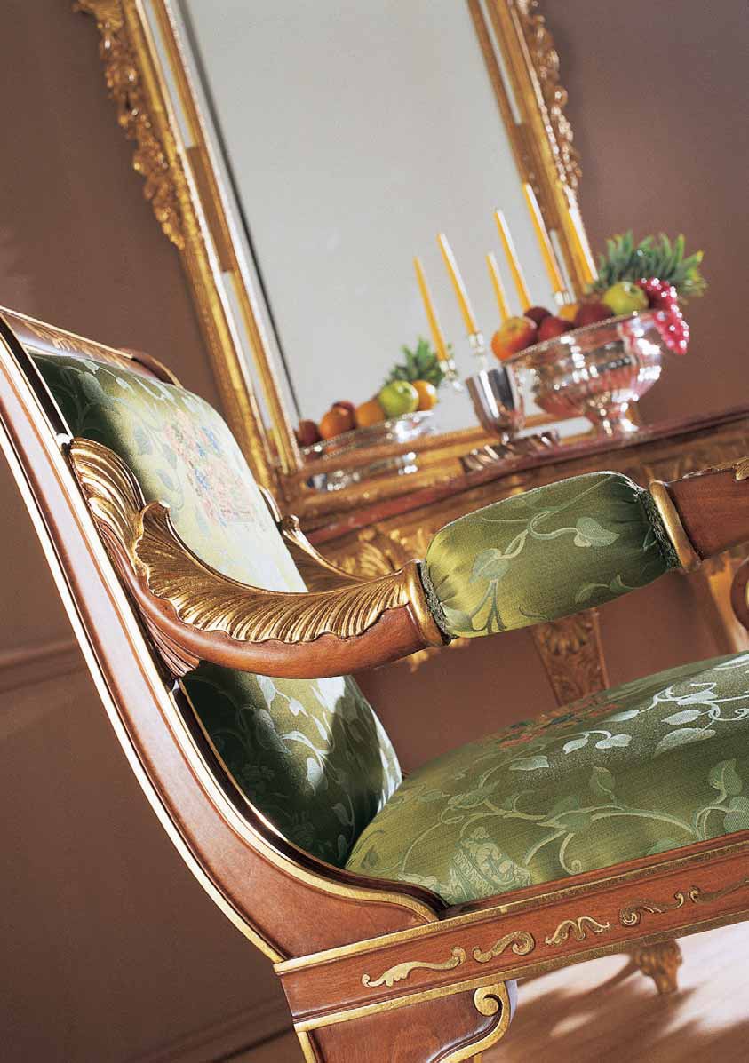 Faraone chair from the Italian manufacturer Zanaboni. Front legs straight, back under the slope. Material - solid wood. The finish offers a glossy lacquer and gilding. Upholstery textile from the collection company. A feature of the design give the curly shape armrests. The model is decorated with carvings made by hand.