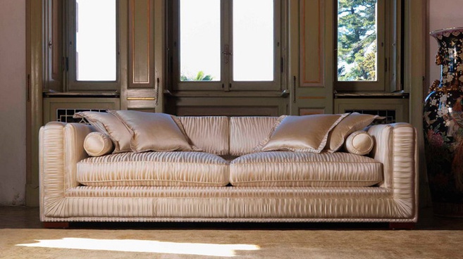 The Bisanzio sofa from Italian manufacturer Zanaboni. Model with a hidden frame. The presented models of two and three-seater sofa. Legs in solid wood. Upholstery textile. The seat cushion is removable. Filler - foam and fluff. Low back is complemented with decorative pillows and cushions. The sofa is made in a classic style.
