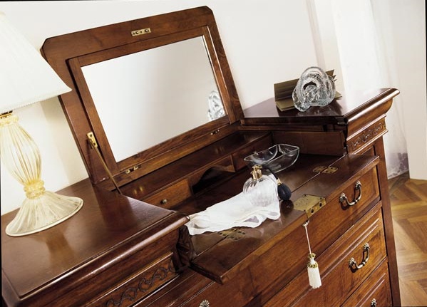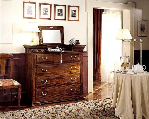 A chest of drawers from Italian manufacturer Zilio. Model with drawers of different size and tilt panel. The frame is made from solid wood. Finish offered a choice from the collection of the company. Accessories metal. Made chest in a classic style.