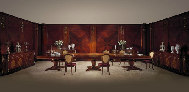 Italian dining room set for the production of DL Decor solid wood. Consists of dining table, sideboard and chairs. Material - solid wood. The frame is covered with varnish. Top supported by robust construction. The chairs are made of wood. Set is made in a classic style.
