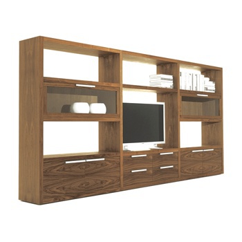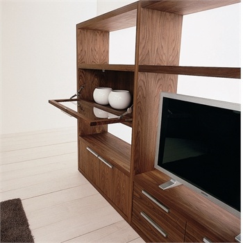Materia modular system from Italian manufacturer Riva 1920. Includes open shelves, drawers and a section with closed doors. Frame and shelves made of solid wood. Accessories metal. Offered lacquer finish or veneer to choose from. There is a place for TV.