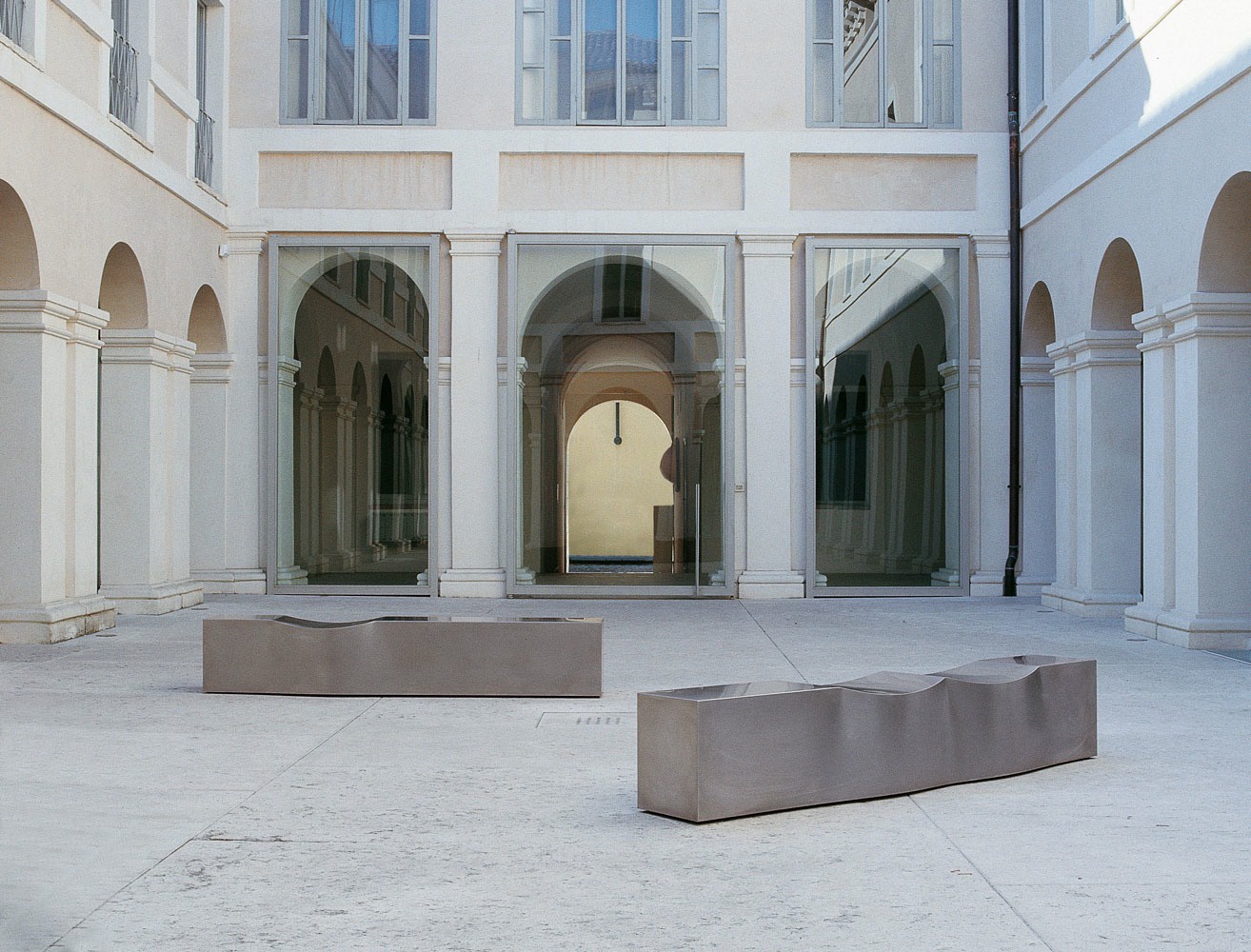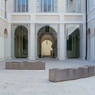 Bench Double Dip from the Italian manufacturer B&B Italia. The base is made of stainless steel. The model is designed for public interiors design. Product color steel.