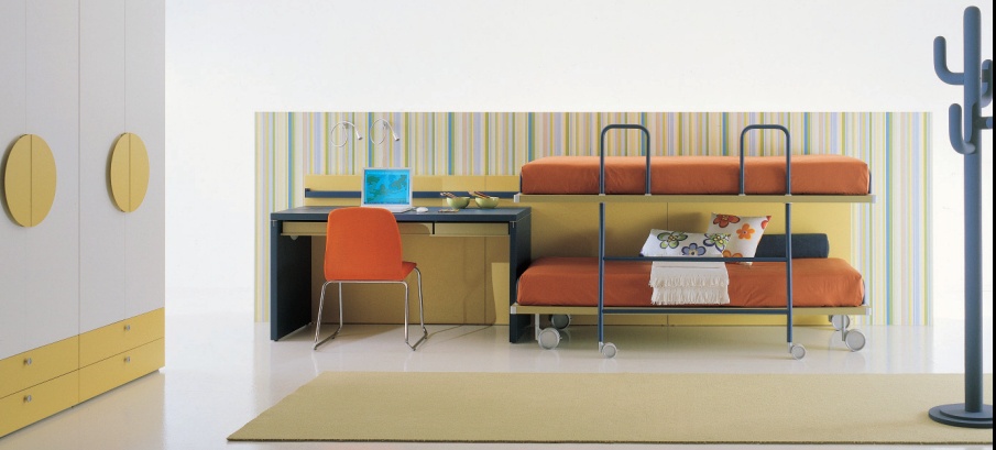 Headsets for children from the Italian manufacturer, Di Liddo & Perego. Set includes bunk bed with metal ladder, Desk, chair with metal legs in the form of tubes and a wardrobe. The furniture is made of solid wood. The bed is complemented by the wheels. Colors - white, gray, yellow and orange.