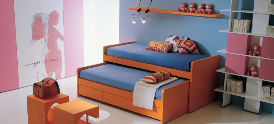 Headsets for children from the Italian manufacturer, Di Liddo & Perego. Set includes bunk bed, shelving and Cabinet. The furniture is made of solid wood. The lower tier, supplemented by boxes hidden under the top. The augmented closed shelving sections. Colors - white, yellow and pink.