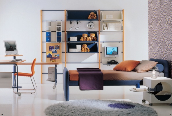 Headsets for children from the Italian manufacturer, Di Liddo & Perego. Set includes bed in fabric, Desk, chair with metal legs in the form of tubes, shelving and Cabinet. The furniture is made of solid wood. Finishing varnish from the company portfolio. Table is on wheels. Colors - blue and orange.