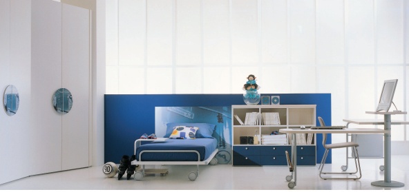 Headsets for children from the Italian manufacturer, Di Liddo & Perego. Set includes a bed, Desk, chair with metal legs in the form of tubes and a wardrobe. The furniture is made of solid wood. The bed and the table supplemented by the wheels. The rack is made with open and closed sections. Finishing varnish from the company portfolio. Colors - white and blue.