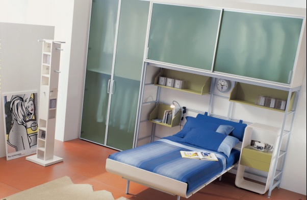 Headsets for children from the Italian manufacturer, Di Liddo & Perego. Set includes bed and modular system. The furniture is made of solid wood. The bed is made with metal legs. Modular system includes: wardrobe and bedside tables. The door is made of frosted glass. Colors - white and green.
