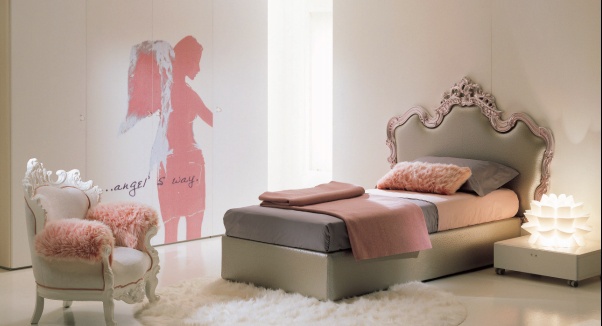 Headsets for children from the Italian manufacturer, Di Liddo & Perego. Set includes bed, armchair and bedside tables. The furniture is made of solid wood. Finish - lacquer and carving. Upholstery - textiles from the company portfolio. Colors - white and bronze.