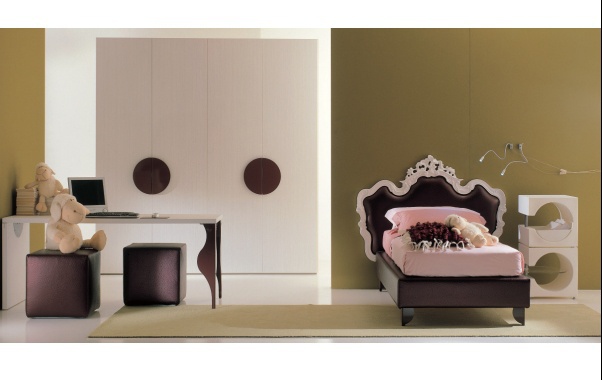 Headsets for children from the Italian manufacturer, Di Liddo & Perego. Set includes bed with high headboard, Desk, stool and wardrobe. The furniture is made of solid wood. Finish - lacquer from a range of companies and carved work. Upholstery - textiles. Colors - white and maroon.
