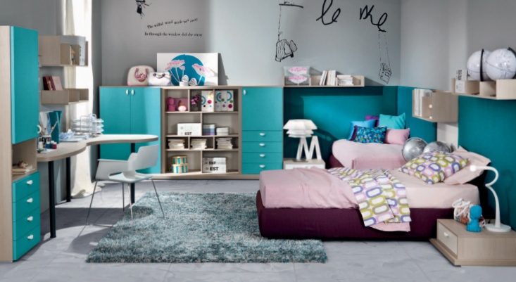 Headsets for children from the Italian manufacturer, Di Liddo & Perego. Set includes a bed, Desk, chair with metal legs in the form of tubes and module system. The furniture is made of solid wood. Upholstery bed - textiles from the assortment of the company. Colors - white and blue.