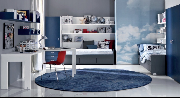 Headsets for children from the Italian manufacturer, Di Liddo & Perego. Set includes two single beds with roomy drawers, Desk, chair with metal legs in the form of tubes and a wardrobe. The furniture is made of solid wood. Finishing varnish from the company portfolio. Colors - white and blue.