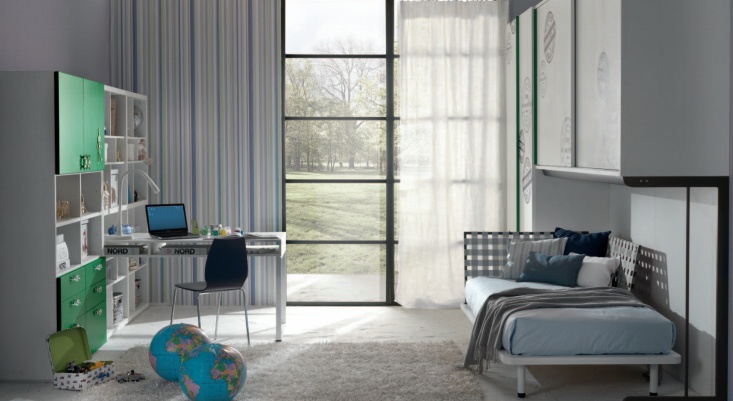 Headsets for children from the Italian manufacturer, Di Liddo & Perego. Set includes metal bed with staircase, Desk, chair with metal legs in the form of tubes and a wardrobe. The furniture is made of solid wood. The bed is made with metal legs with plastic glides. Colors - white and green.