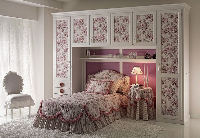 Headsets for children from the Italian manufacturer Halley, collection Junior. Bed with upholstered headboard. The material is solid wood and textile. Furniture richly decorated with carvings. The main decorative material present in the collection – textiles. Design complete - hangings, stitch-Capito, fringe. Colours in stock.