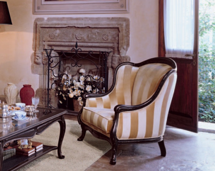A chair from the Italian manufacturer Tonin casa. The frame and legs made from solid wood. The glossy lacquer finish is offered from the assortment. Upholstery textile. Seat cushion is removable. Filler - polyurethane foam. The model is made in classic style.