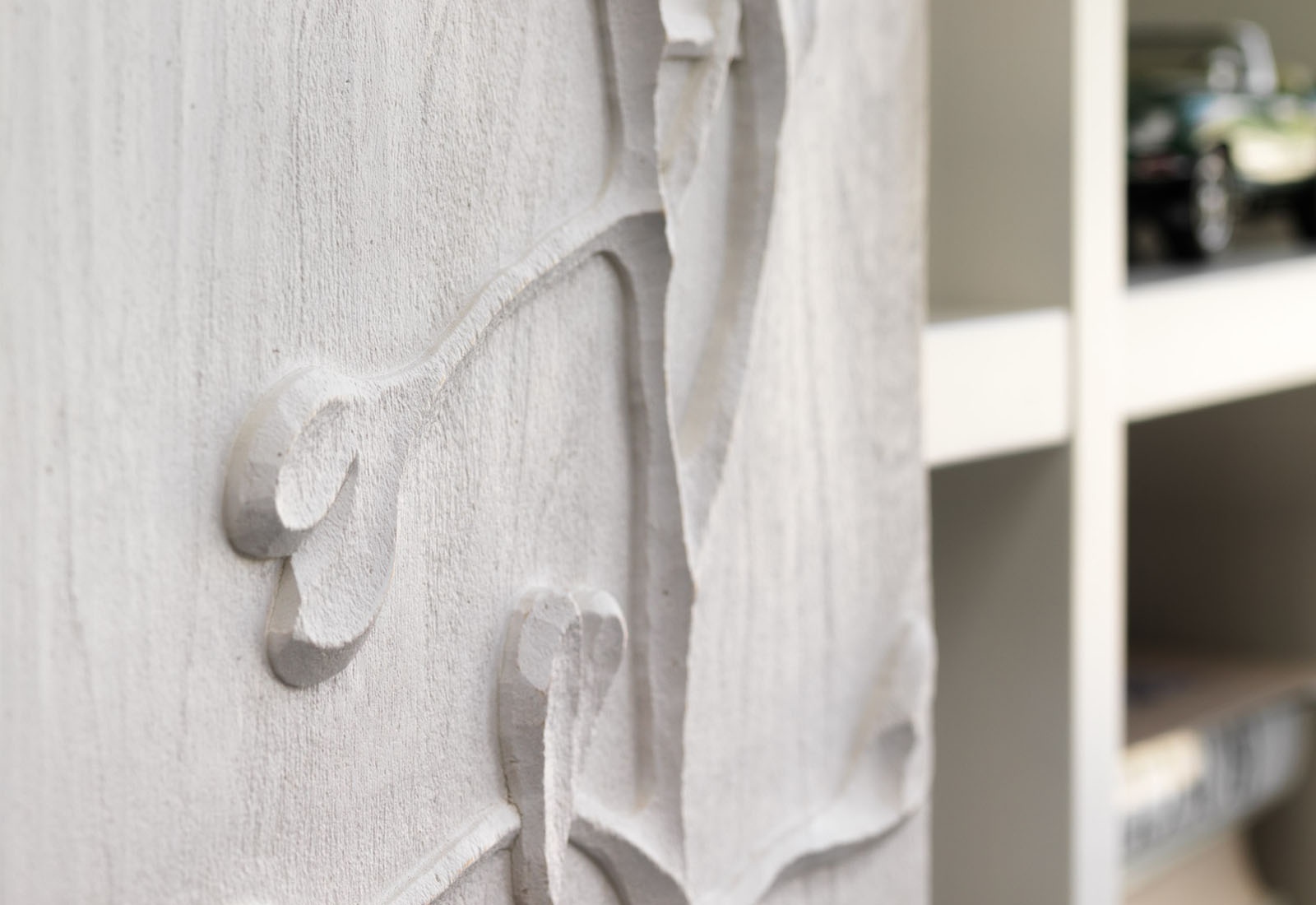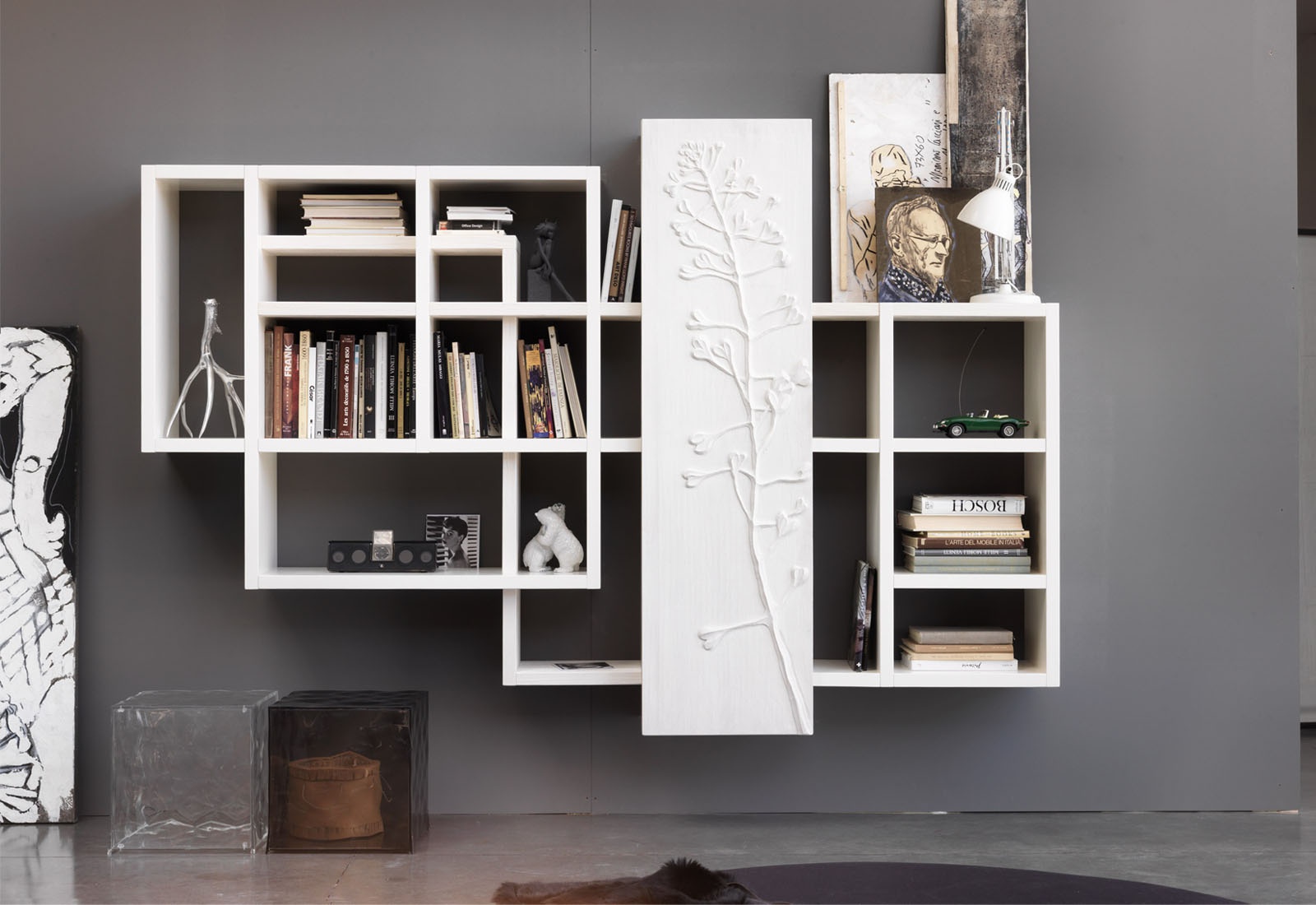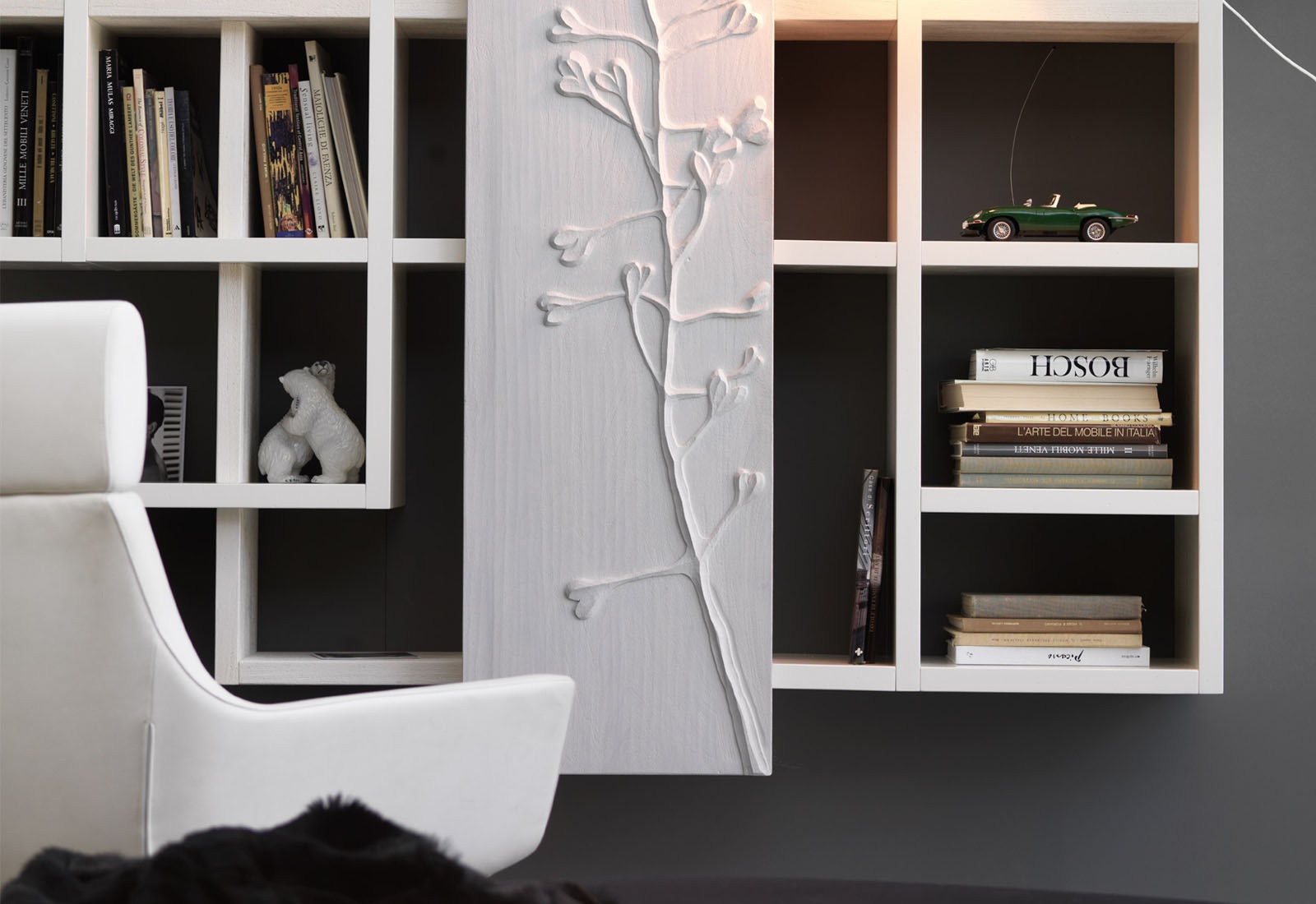Modular storage system Composizione 166 from the Italian manufacturer Marchetti. The frame is made of wood. The facade is decorated with a decorative ornament. Finish options: walnut, glossy white or black.