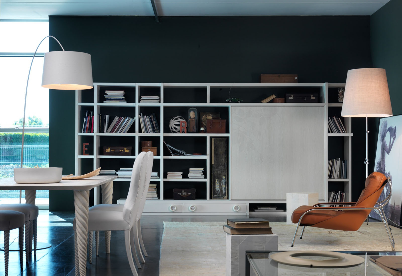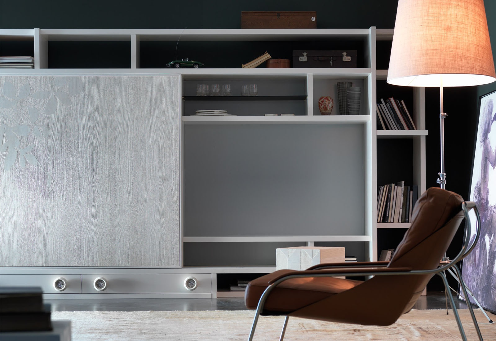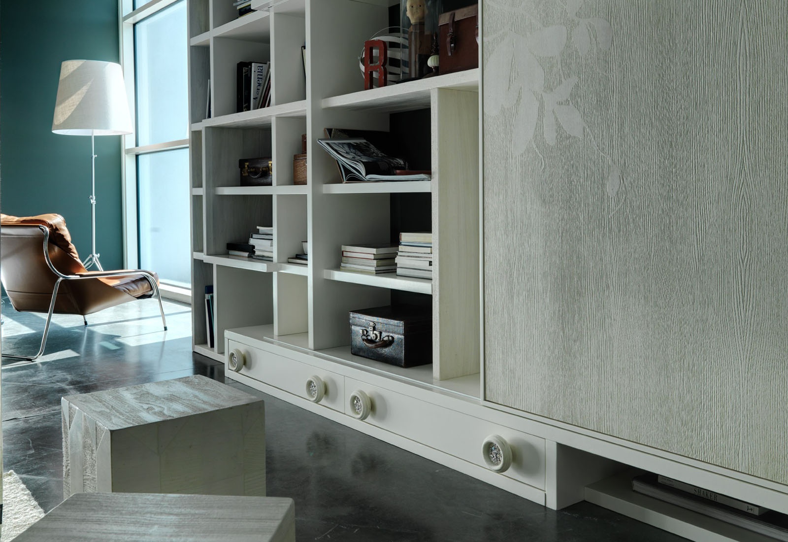 Modular storage system 165 Composizione from the Italian manufacturer Marchetti. Modular storage system in a modern style, made of natural wood. The internal content is drawers and shelves. The facade is decorated with floral ornament. Finish options: walnut, white or black.