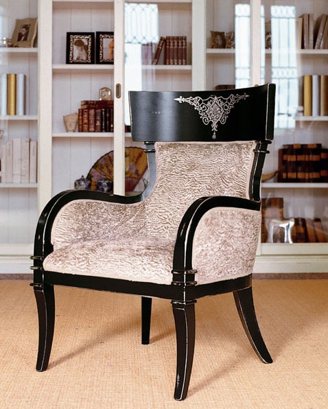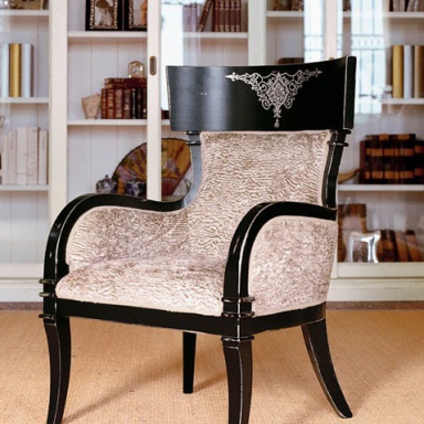 A chair from the Italian manufacturer Tonin casa. Model with a high back and rounded armrests. The frame and legs of solid wood. Finish option to choose from a collection company. Upholstery textile. There are several color options. The chair is made in a classic style.