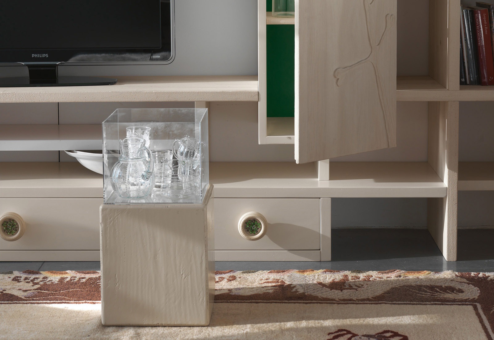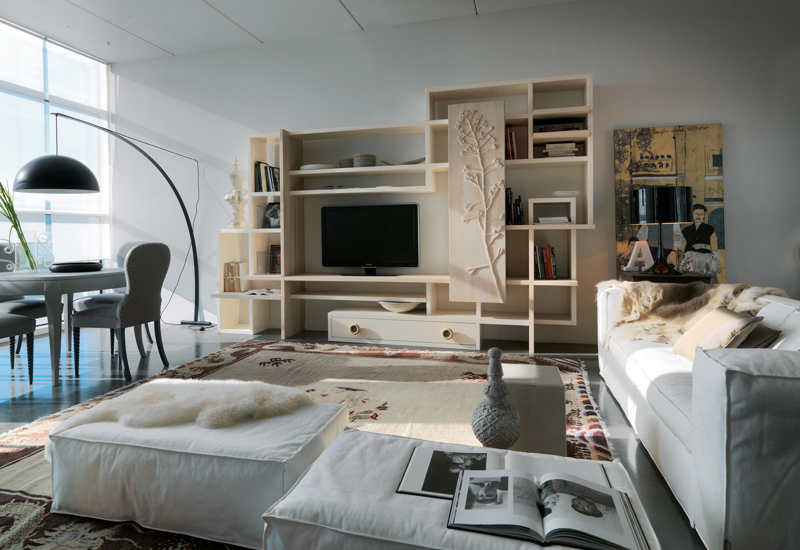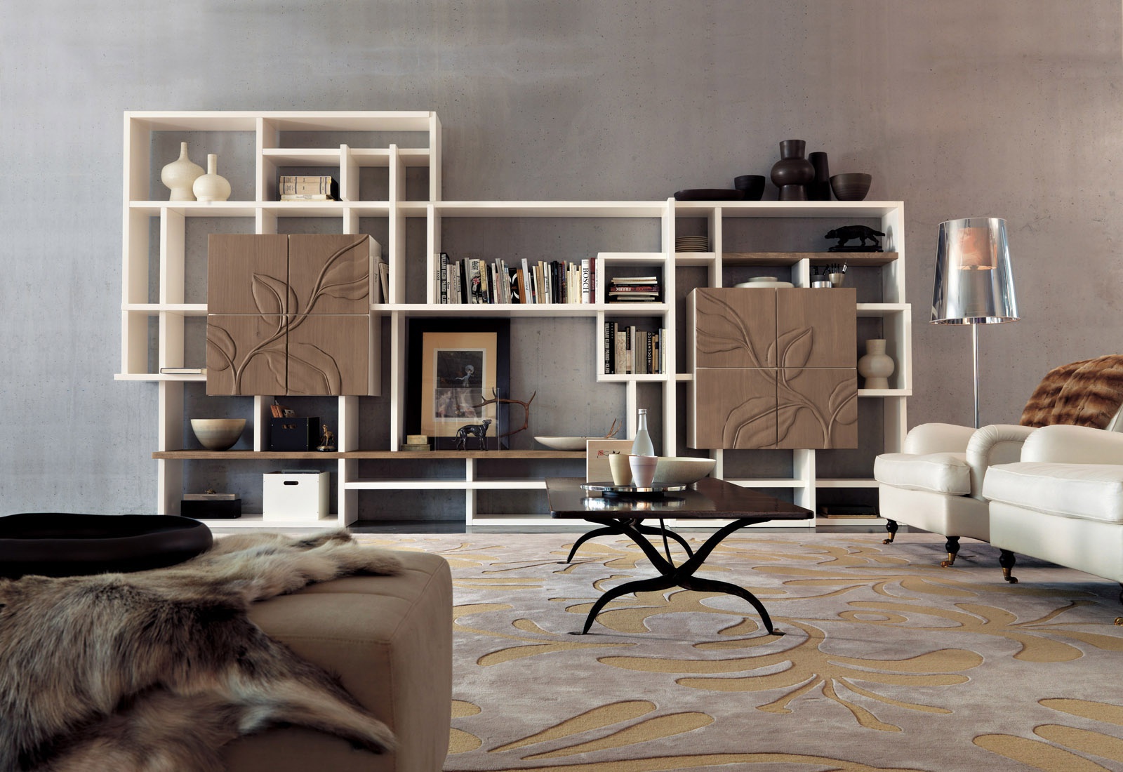 Modular storage system for books and TV from the Italian manufacturer Marchetti. The frame is made of wood. The facade is decorated with a decorative ornament. Finish options: walnut, glossy white or black. Colours in stock.