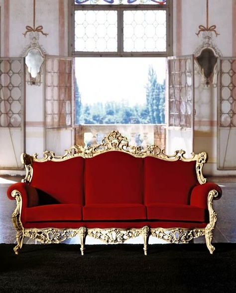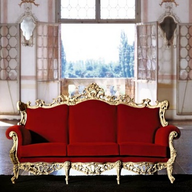 Three seater sofa from the Italian manufacturer Tonin casa. The frame and legs are made of solid wood. The surface is treated with varnish Golden brown. Seat and back covered with textiles. The filler is not deformable polyurethane foam. The model is richly decorated with hand-carved.