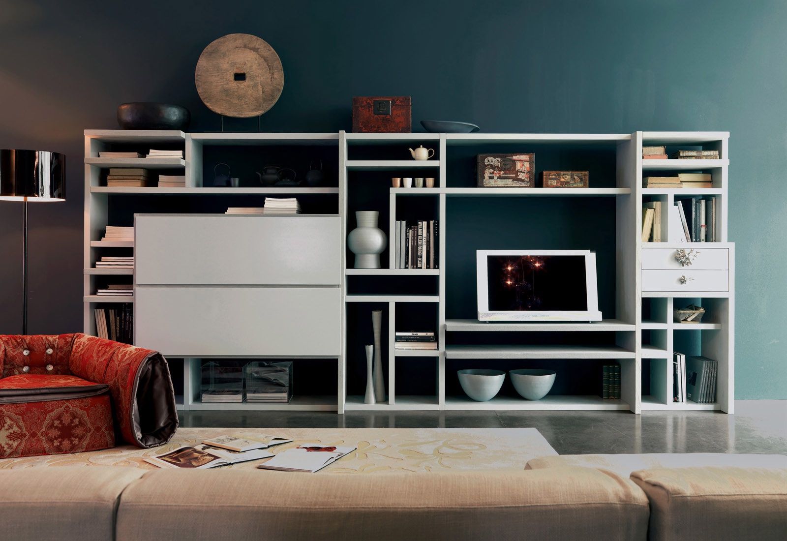 Modular storage system for books from the Italian manufacturer Marchetti. The frame is made of wood. The facade is decorated with a decorative ornament. Finish: walnut, glossy white or black. Colours in stock.