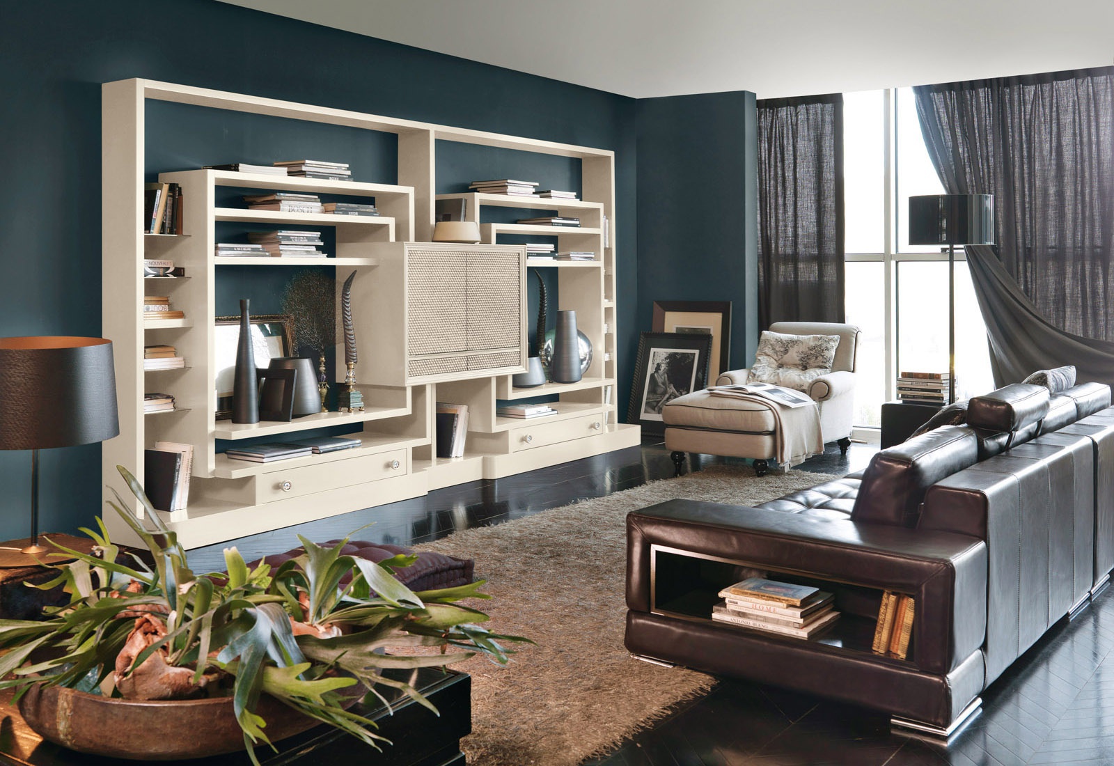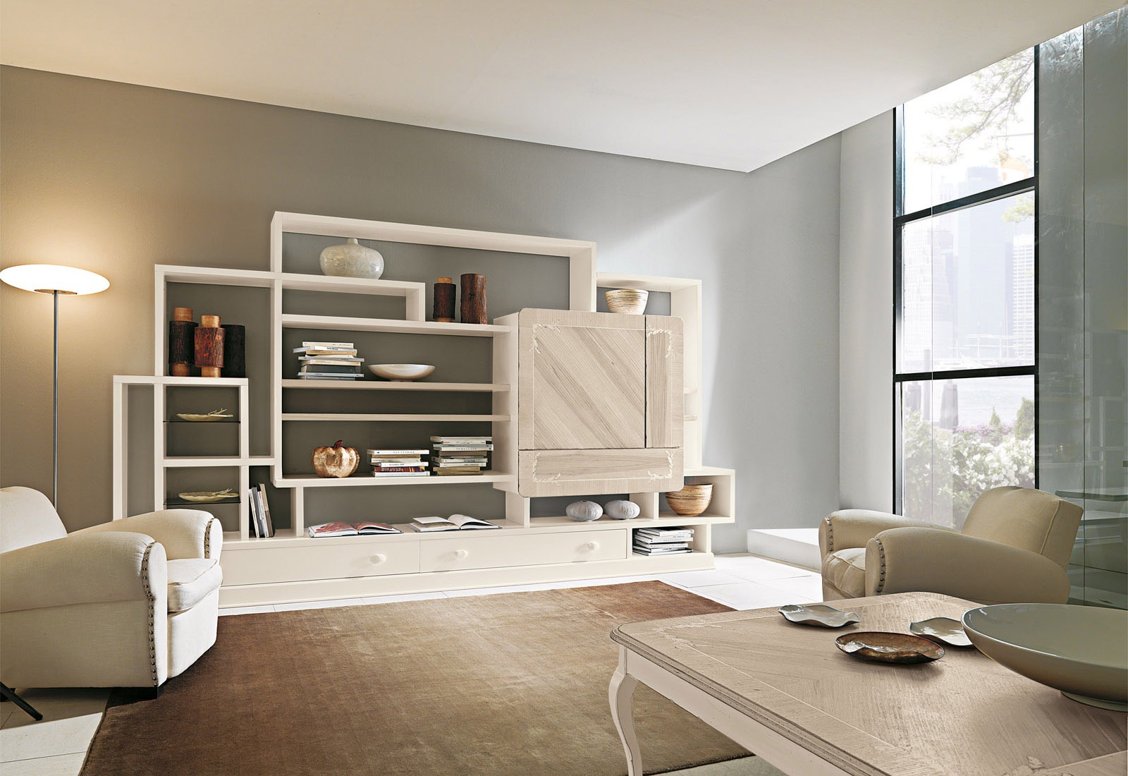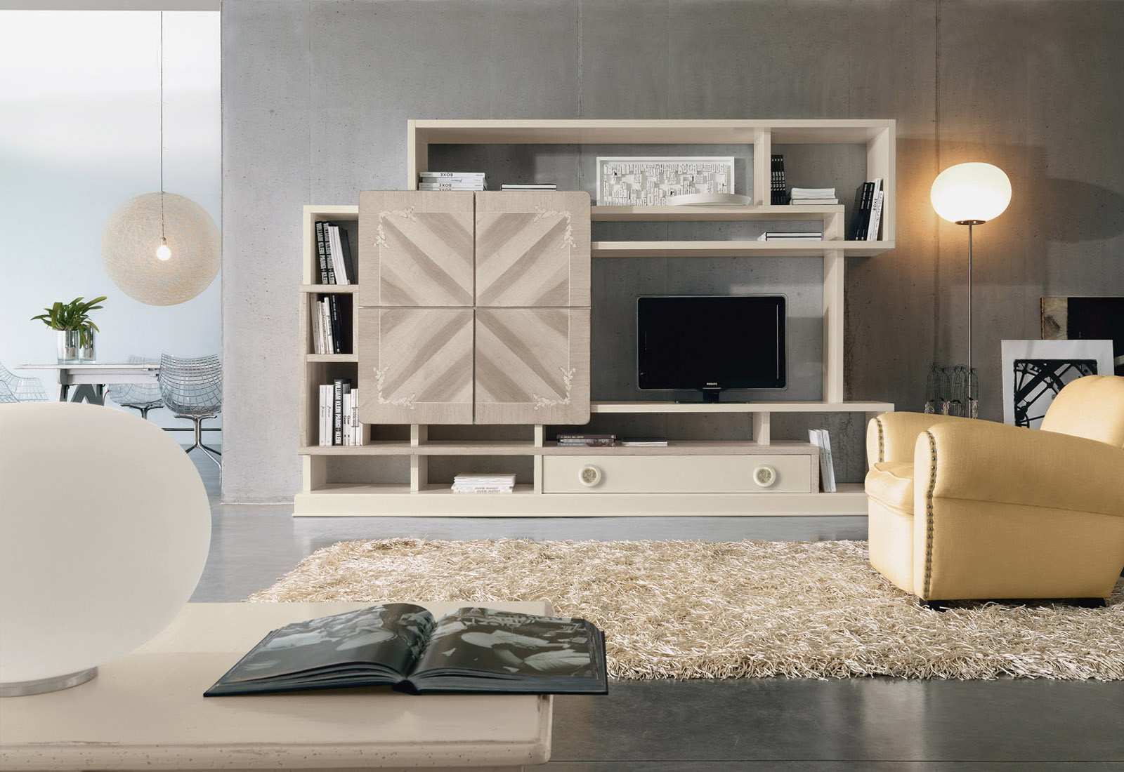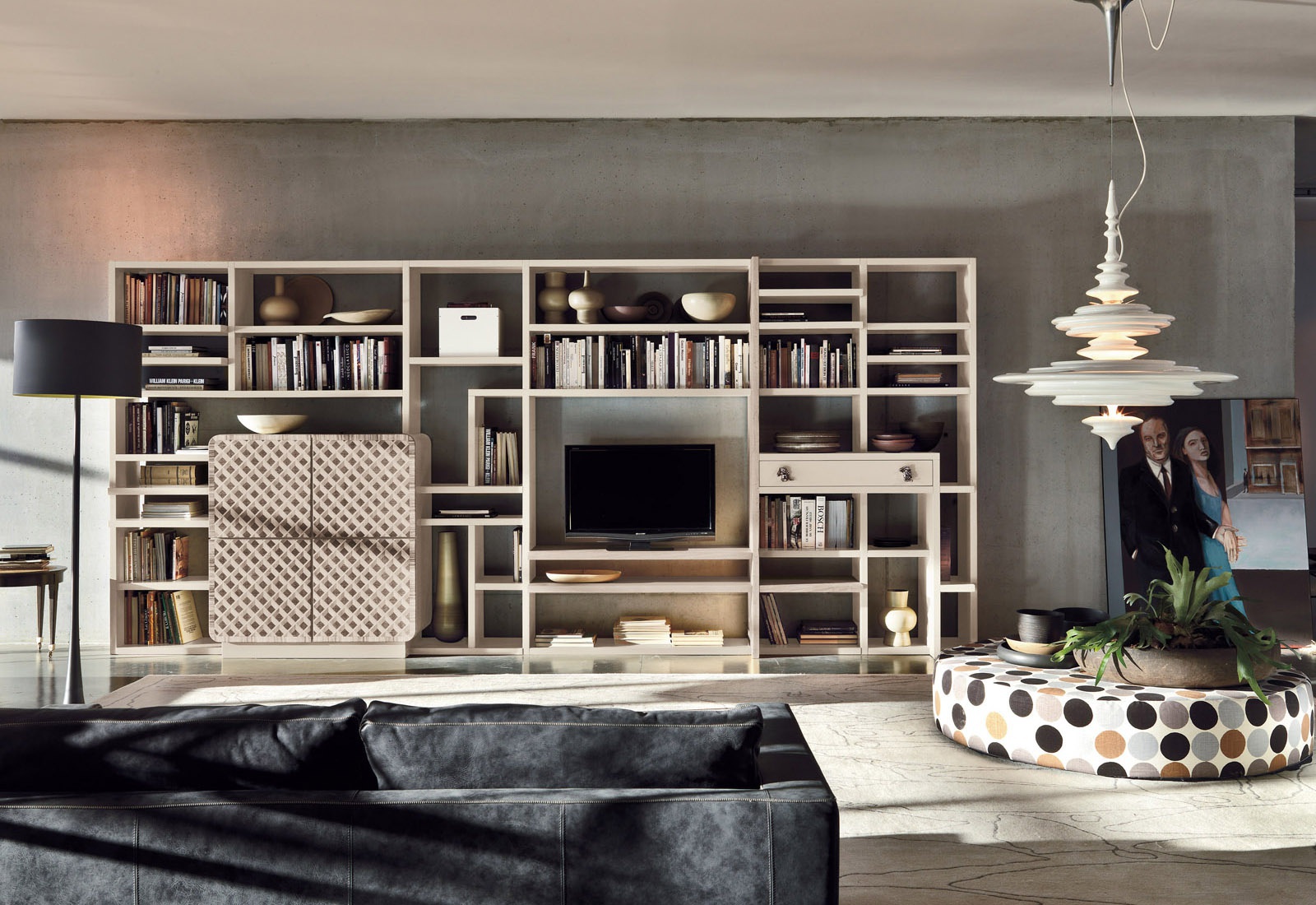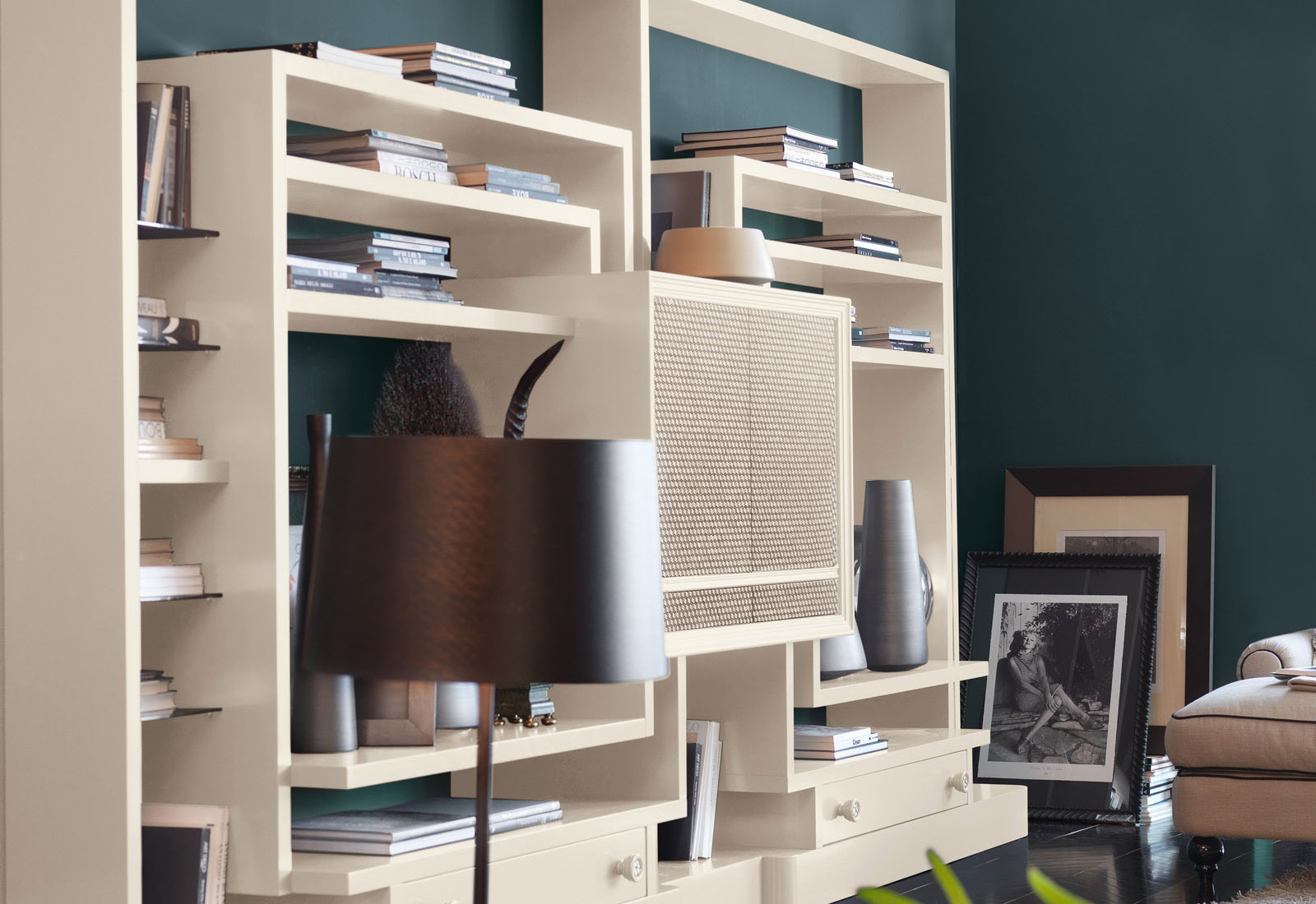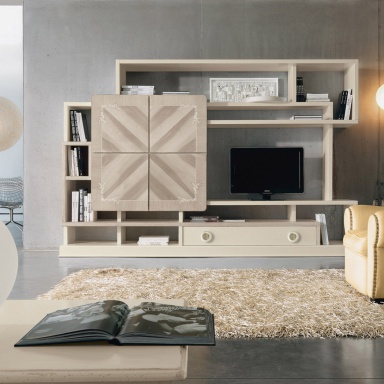 Modular storage system for books from the Italian manufacturer Marchetti. The frame is made of wood. The facade is decorated with a decorative ornament. Finish options: walnut, glossy white or black.