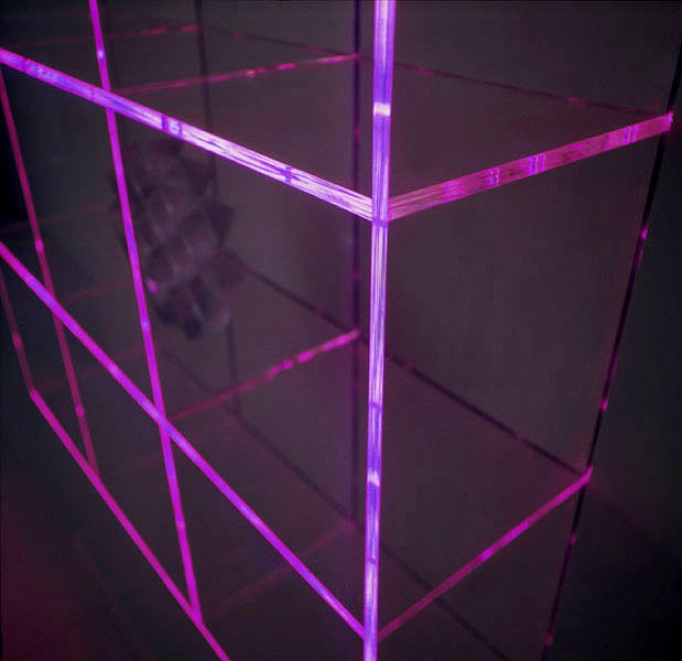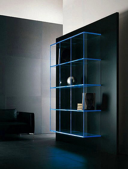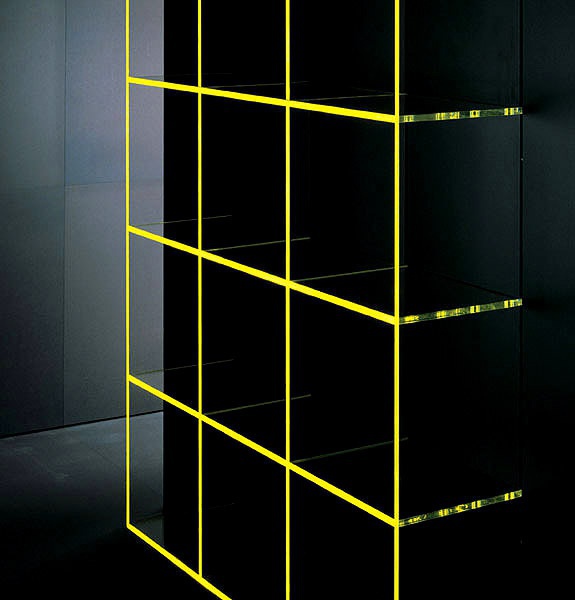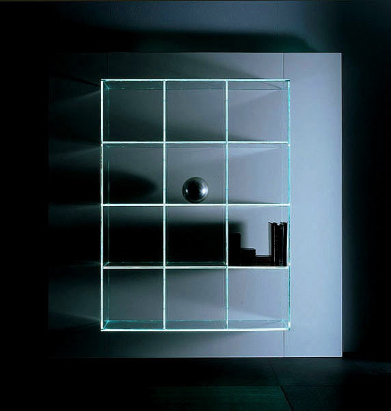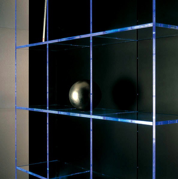 The rack with the rear wall of MDF, the profile of the steel shelves and polymethyl methacrylate Matrix, Acerbis International