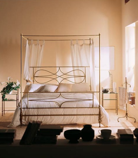 Double canopy bed from Italian manufacturer Tonin casa. Model with a high headboard and footboard. The frame and legs are made of metal. Finish offered several options to choose from. Upholstery textile. The originality of design and elegance are the distinguishing features of this bed.
