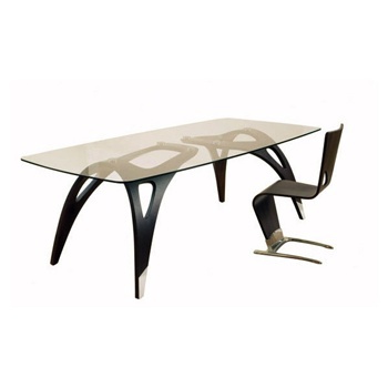 Dyna dining table from French manufacturer Roche Bobois. The model is made in modern style. The legs are made of solid wood and wood veneered. Top of rectangular shape with rounded corners of clear glass. In addition offered chairs of similar design.