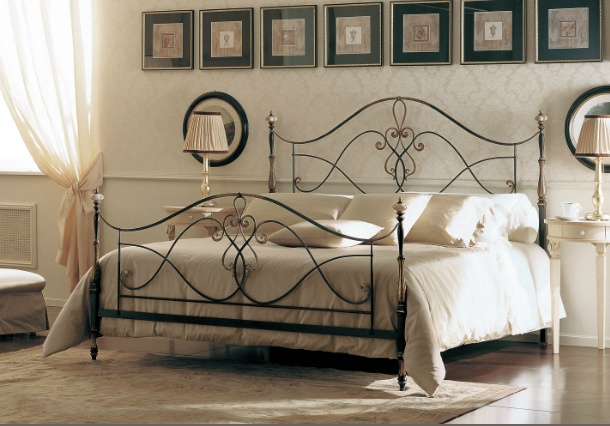 Double bed, from the Italian manufacturer Giusti Portos. The frame is made of wood and metal. Headboard and footboard decorated with wrought iron elements with floral ornaments. The legs are made of metal. The model will perfectly complement a contemporary bedroom interior.