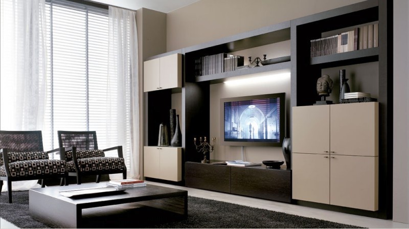 Modular system from Italian manufacturer Tumidei. Consists of open regiment and sections with hinged doors. There is a place for TV. Material - veneer varnished. Accessories metal. The augmented model with built-in lighting.
