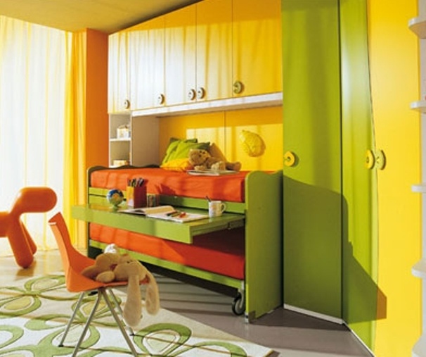 Children's set from the Italian manufacturer Julia Arredamenti. Furniture for children's room with two sleeping places. The frame is made of particle Board or veneer wood and melanin. Product color bright yellow with green and orange. The model is made in modern style.