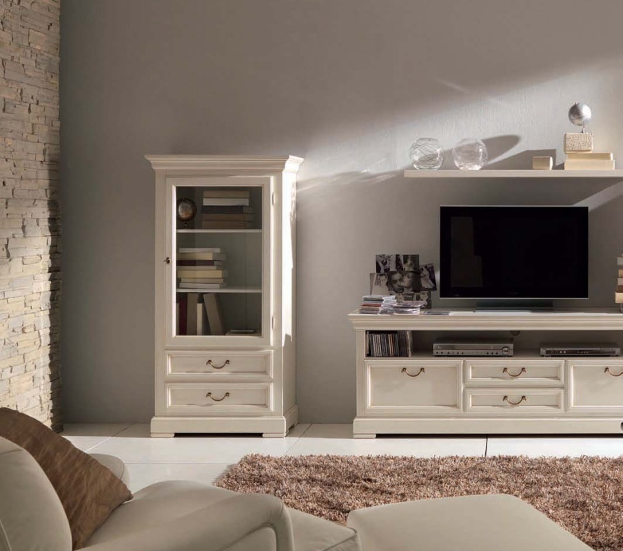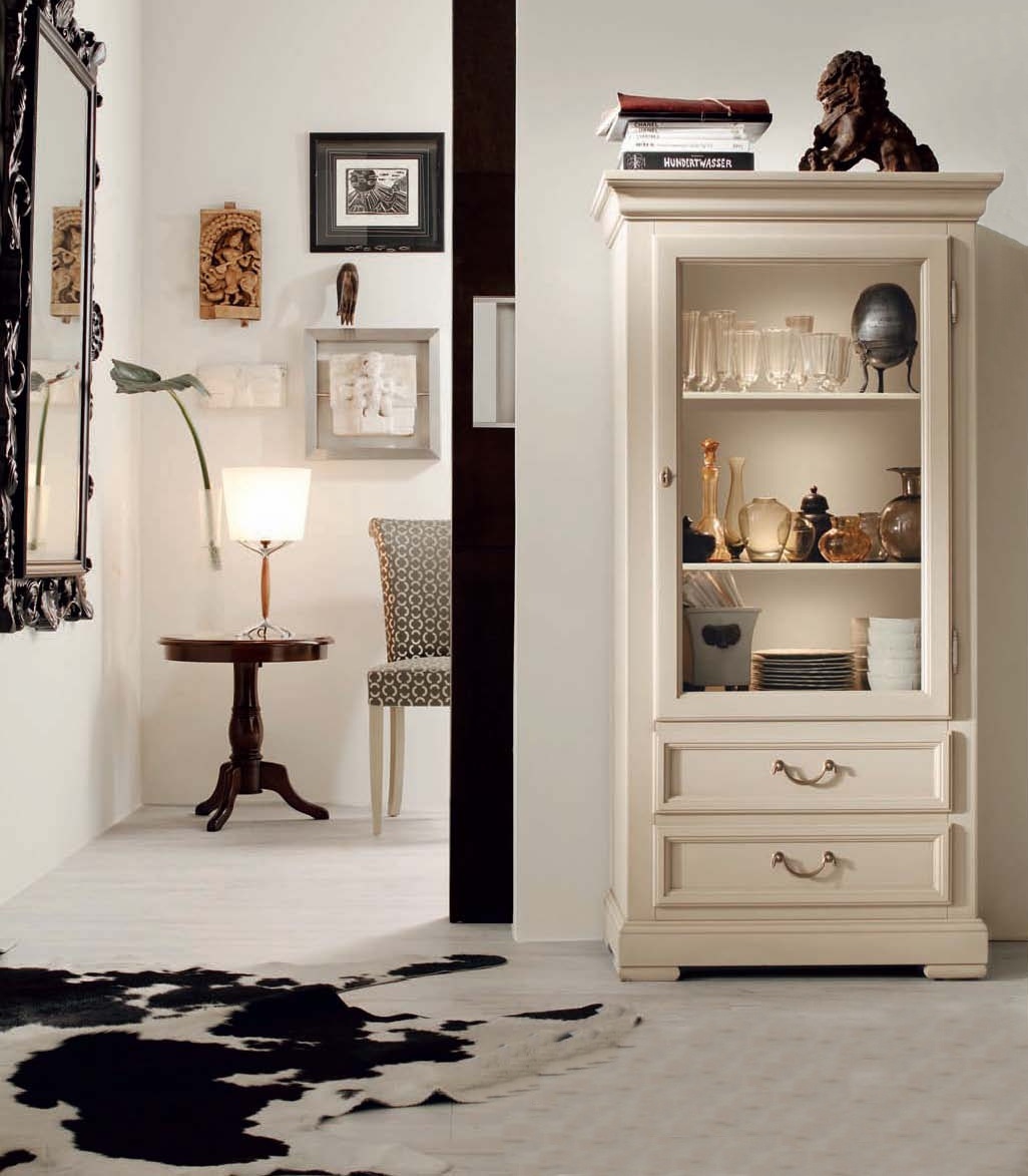 Showcase Mirabeau produced by the Italian factory Selva. The frame is made from solid Tulip wood, veneer finish cherry. The upper part of the door, the sash glass, with two removable shelves, glass or wood. Interior lights. The lower part with two drawers. Accessories metal, copper color. Model in white color, made in the style of Louis Philippe.