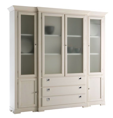 Showcase Tango from the Italian manufacturer Selva. The frame is made from solid Linden and veneer finish poplar. The Central part of the showcase two door with three drawers. Inside two removable shelves. Side Windows are two pencil case. The lower part of one door with one removable shelf. In top two adjustable shelves. Model with internal lighting. Upper door parts frosted glass. Metal accessories, silver color. All the doors are locked. The model is made in classic style.