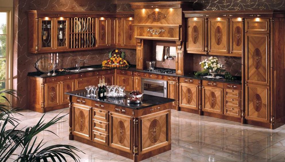 Kitchen with island Cleopatra in a modern style from Italian manufacturer Emegroup. The frame is made from solid wood, varnished. Set includes multifunction cabinets with appliances and a working Desk-island. Fittings - metal. Cabinets equipped with hinged doors. Furniture has been hand carved. Work surfaces made of natural stone.