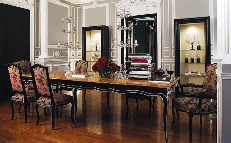 Set for the dining room from the French manufacturer Roche Bobois. Includes dining table and chairs with or without armrests. Material - solid wood. Offered lacquer finish or veneer. Upholstery textile. Variant colors and textures to choose from the collection of the factory. The armrests are complemented with soft pads. Set made in a classic style. Different capacity and durability.